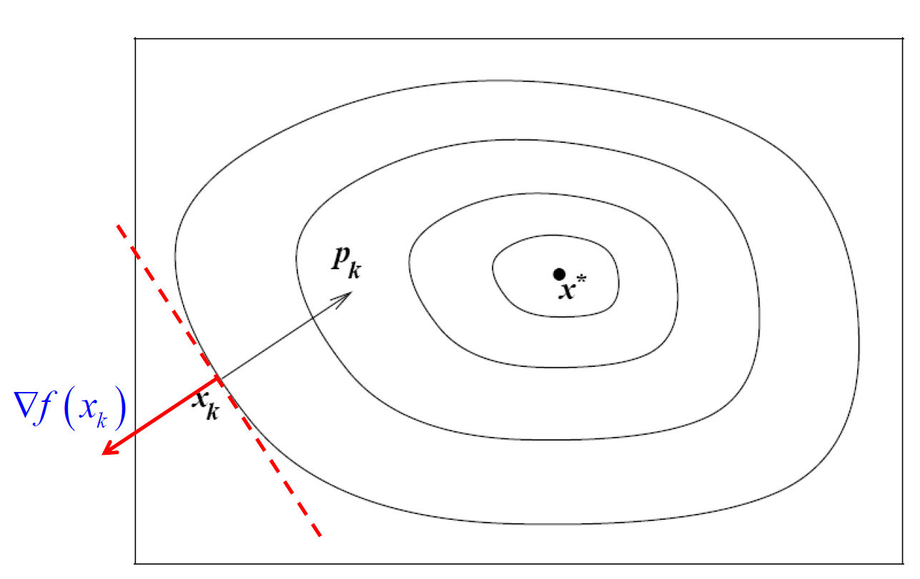 - 在线搜索策略(line search)中,算法首先选择一个搜索方向 ,然后从当前迭代点 出发,沿该方向寻找一个函数值更低的新迭代点。